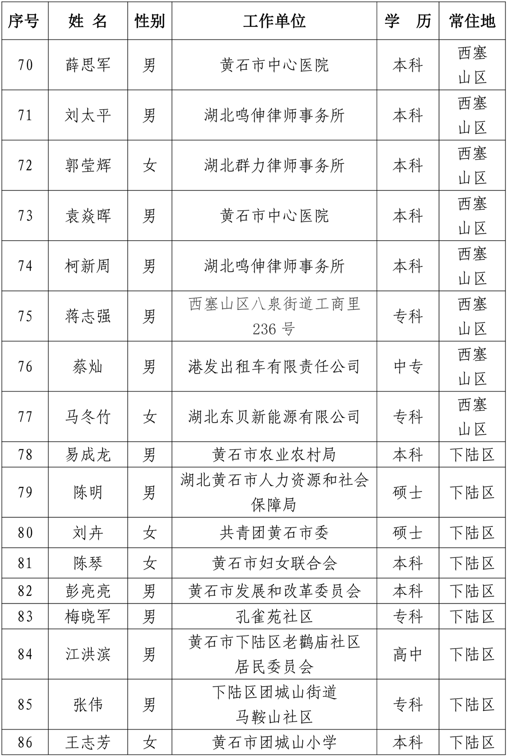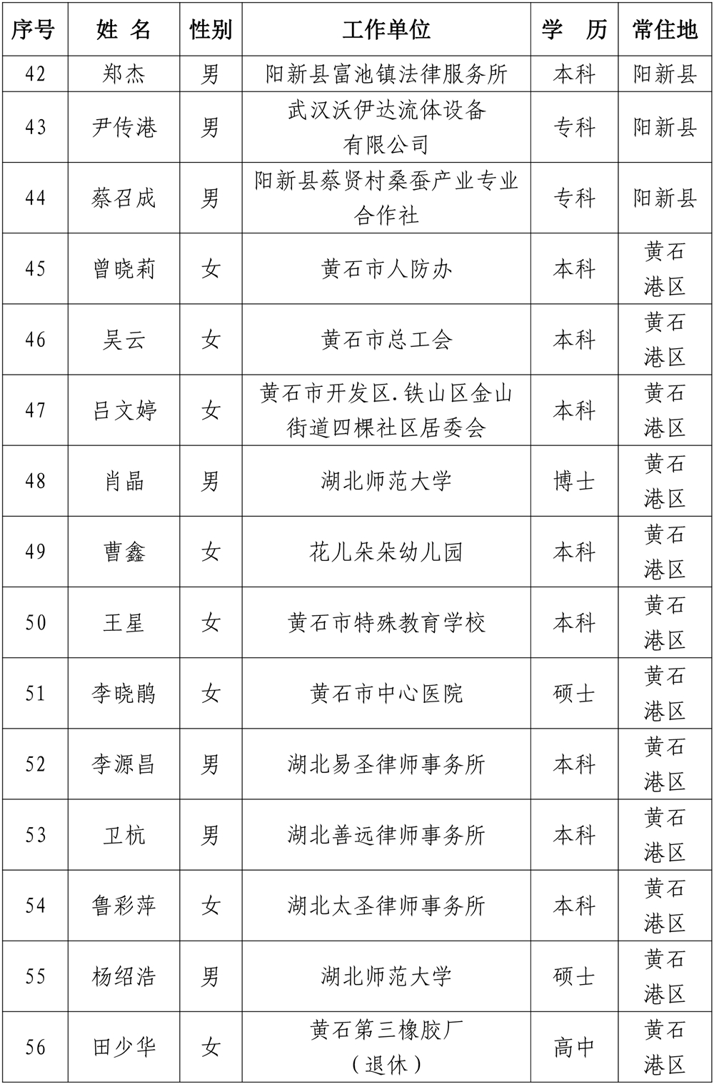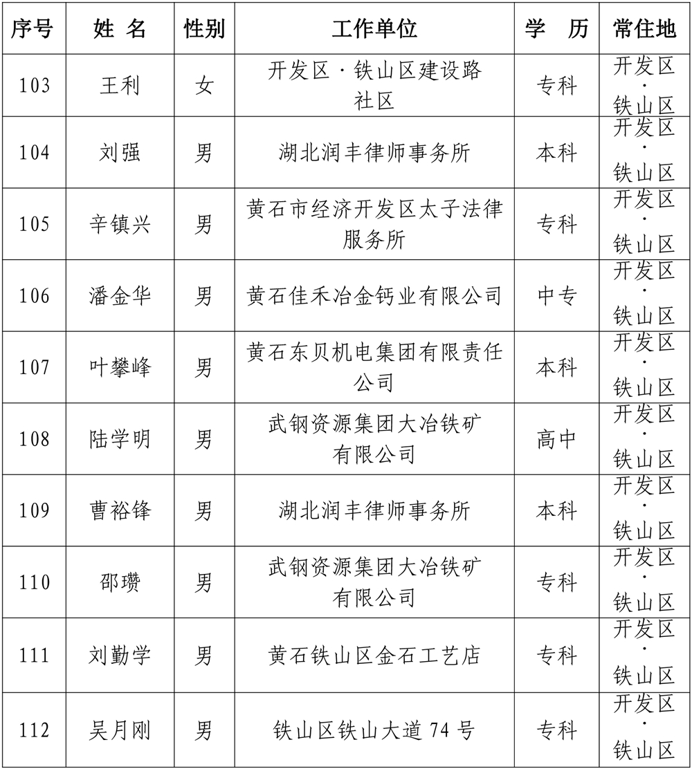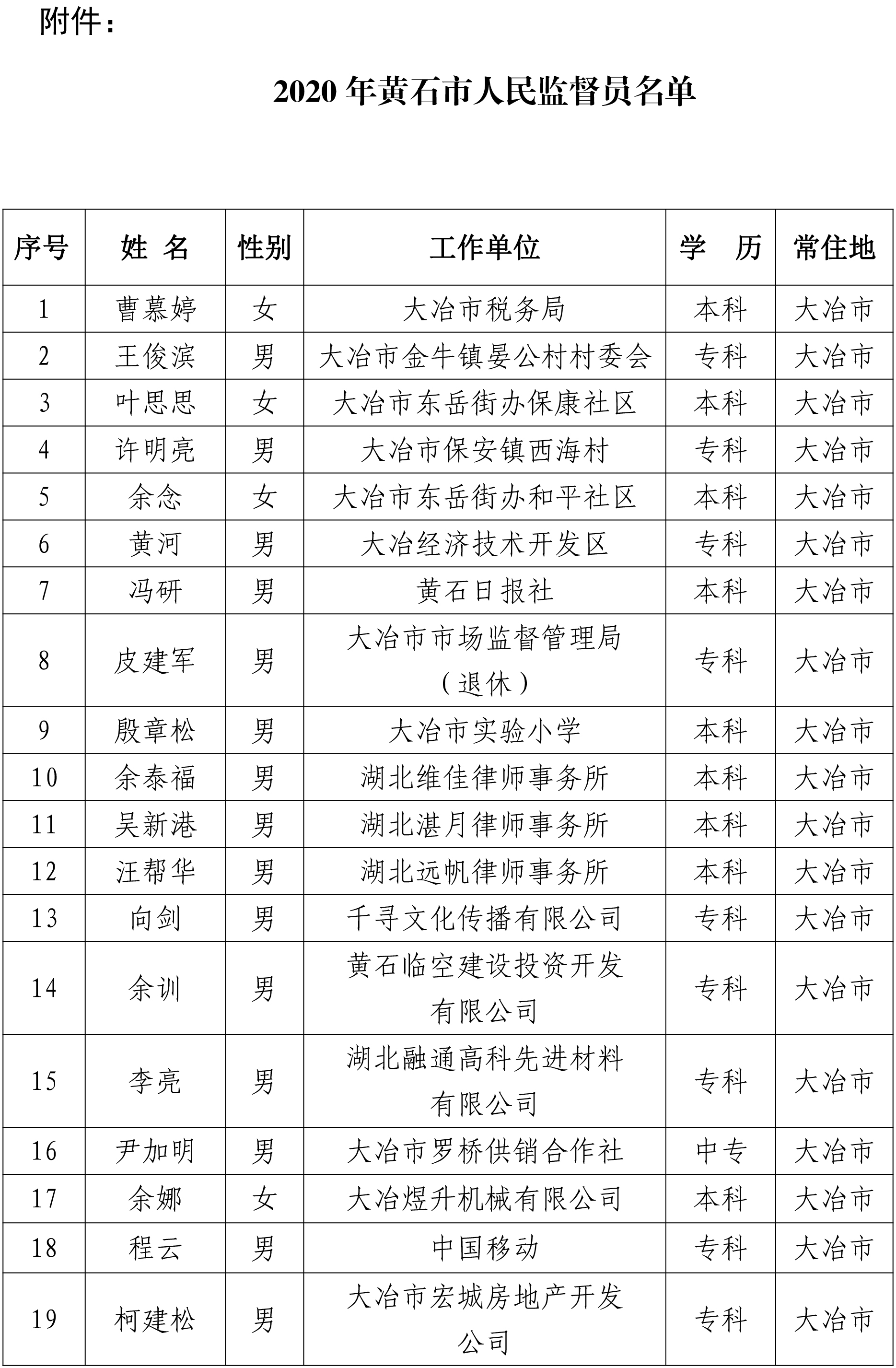根据最高人民检察院、司法部《人民监督员选任管理办法》规定,经公开报名、资格审查、组织考察、组织评议、拟任人选公示等程序,我市决定曹慕婷等112名同志任黄石市人民监督员(名单附后),任期五年,自2020年9月15日至2025年9月15日。