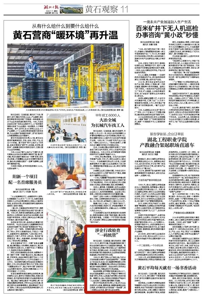 黄石市司法局有关负责人介绍,针对企业反映的多头检查、重复检查、随意检查等执法扰企现象,该市推动涉企行政检查“一码统管”,进一步减轻企业负担,提升涉企执法质效。