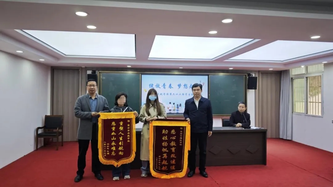 典礼尾声,2名家长代表满怀感激向学校敬献锦旗,“重塑人生引航向恩重如山永难忘”“悉心教育改迷途助娃扬帆再启航”的赠语,道出了家长们对学校悉心教育、帮助孩子迷途知返、重塑未来的由衷谢意。