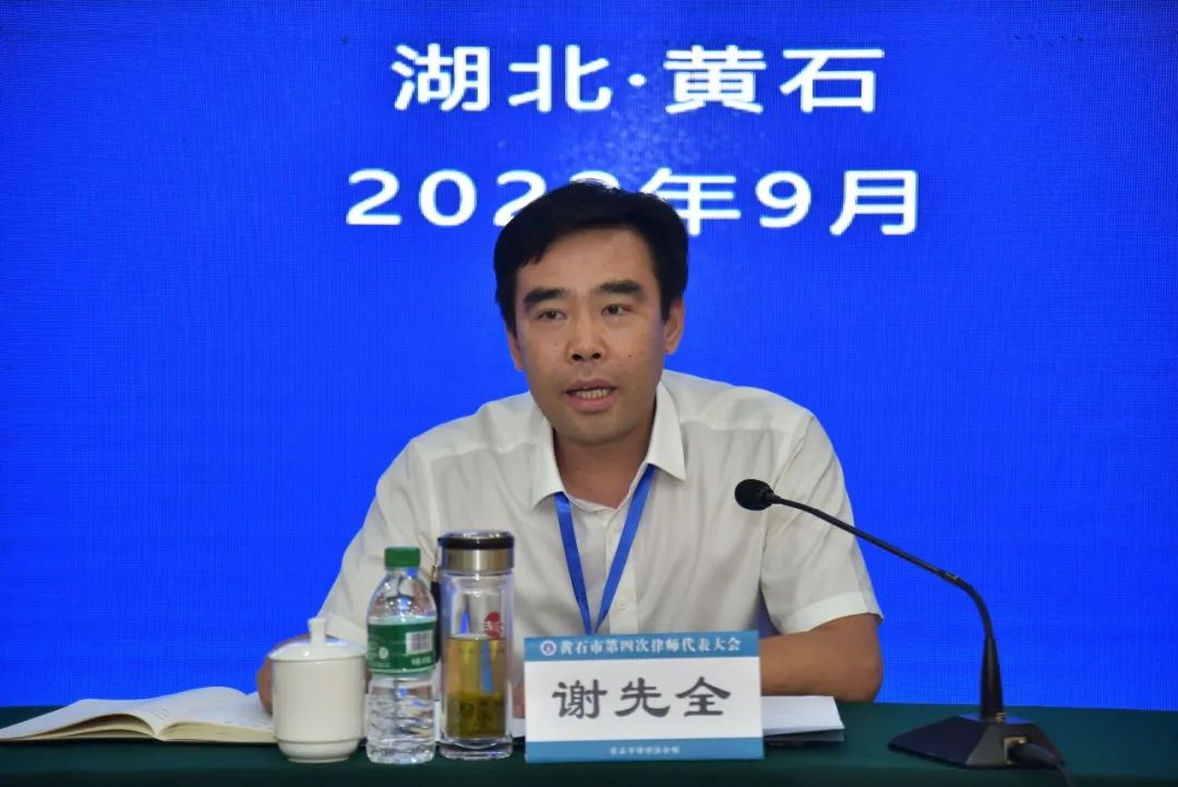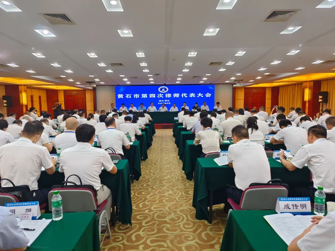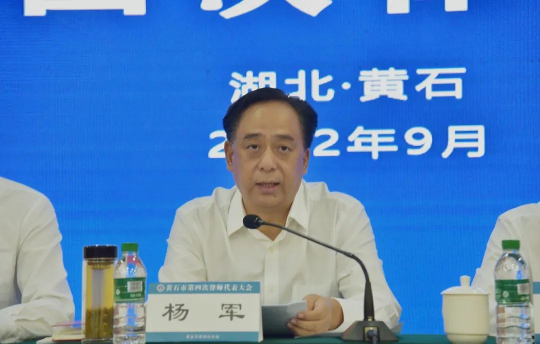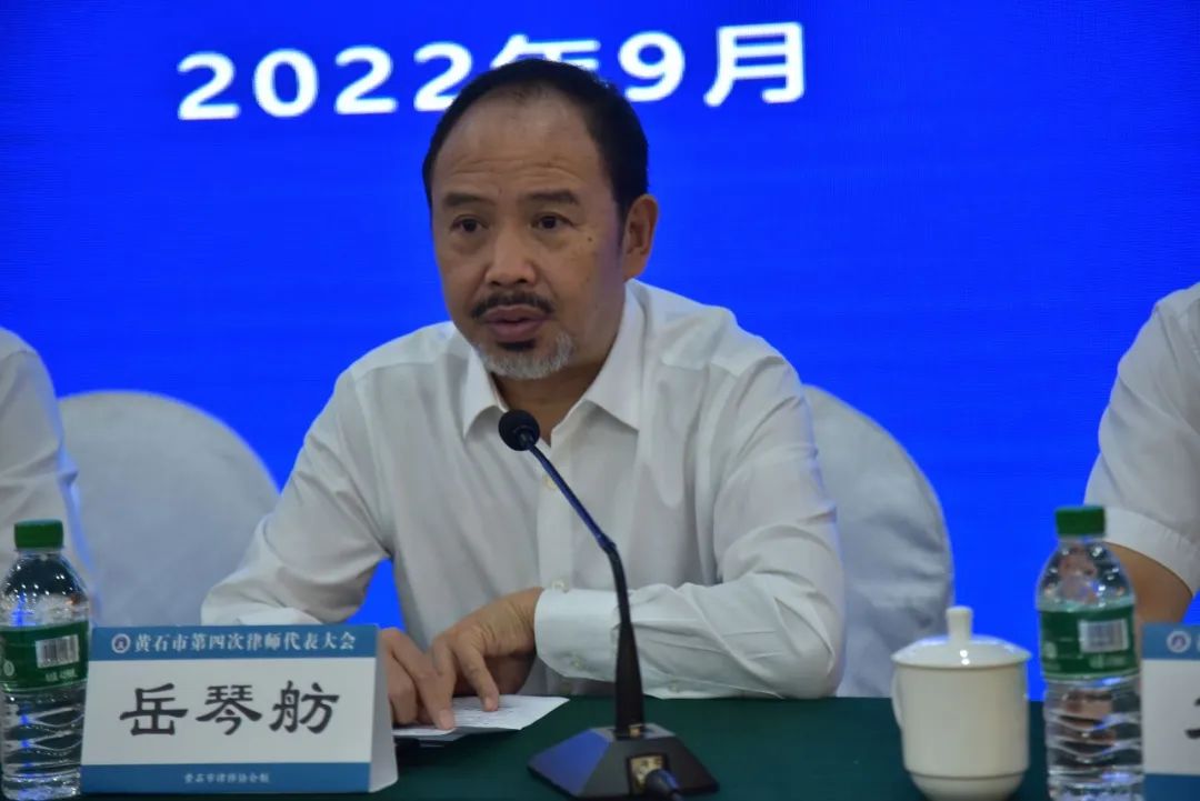 2022年9月21日,黄石市第四次律师代表大会在磁湖山庄召开。全国律协副会长、省律协会长岳琴舫,省司法厅律师工作处副处长李鑫,省律协秘书长刘健,市委副书记、政法委书记杨军,副市长、市公安局局长黄志勇,市法院院长刘恒明,市委政法委常务副书记梅向阳,市检察院副检察长秦国文,市国家安全局局长方维平,市民政局副局长柯怀东以及市、区(县市)司法局领导出席会议。全国律协副会长、省律师协会会长岳琴舫致辞,市委副书记、政法委书记杨军讲话,市司法局党组书记、局长谢先全主持会议。