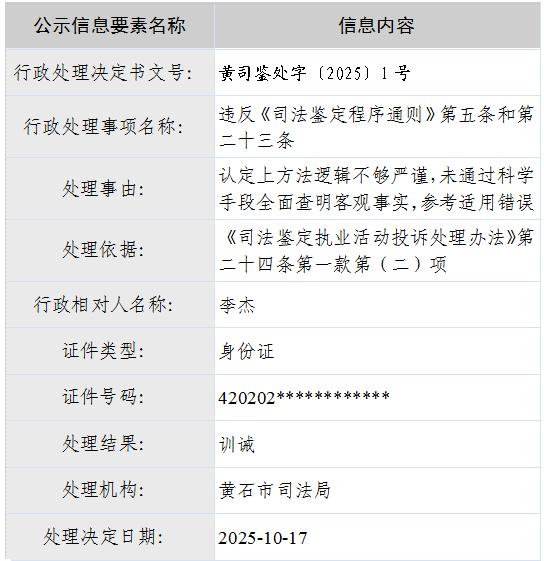 黄石市司法局行政处理决定书(黄司鉴处字〔2025〕1号)