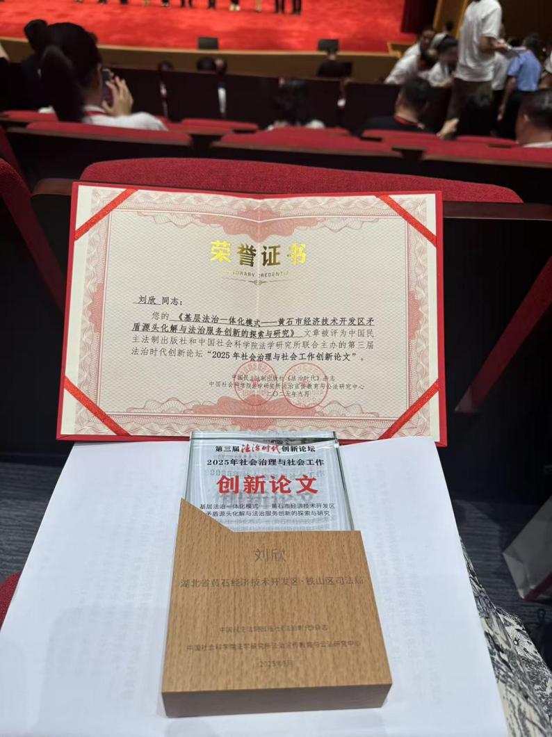 9月20日,在由中国民主法制出版社、中国社会科学院法学研究所联合主办的第三届法治时代创新论坛暨全民普法40周年、首届法治发展创新、首届法律服务业高质量发展研讨会上,黄石市经济技术开发区·铁山区司法局刘欣同志撰写的论文《基层法治一体化模式——湖北省黄石市经济技术开发区矛盾源头化解与法治服务创新的探索与研究》入选“2025年法治创新案例和创新论文”。
