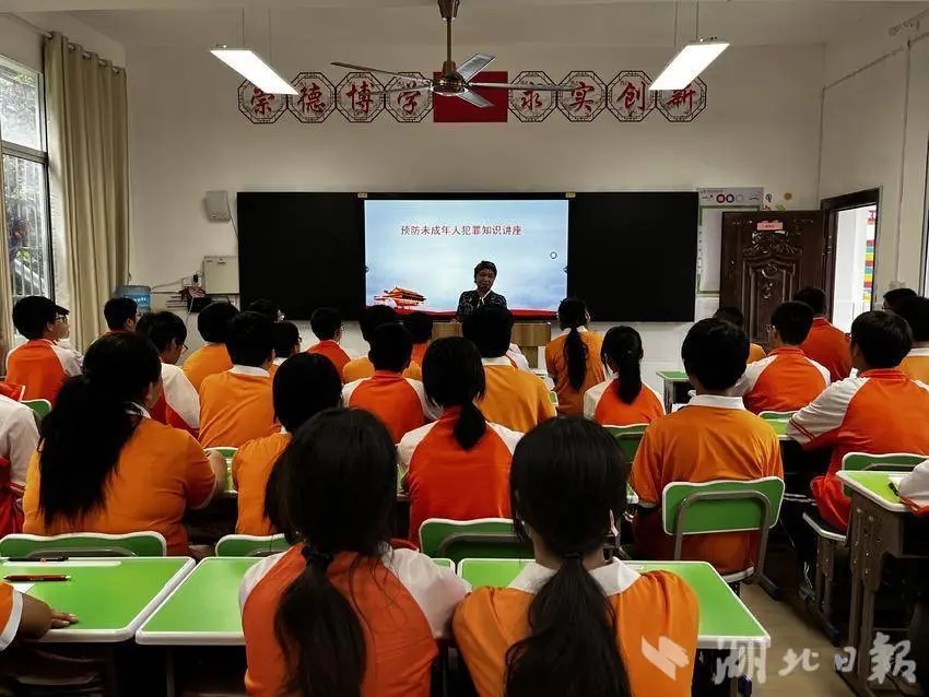 紧随其后的核心环节,由黄石市“八五”普法讲师团成员、市律师协会未成年人保护委员会主任鲁彩萍担纲主讲。鲁律师聚焦与青少年息息相关的《中华人民共和国未成年人保护法》《中华人民共和国预防未成年人犯罪法》和《未成年人网络保护条例》这“三大法宝”,进行了一场“案例式”“互动式”的精准普法。重点探讨了如何识别和应对校园欺凌,通过剖析典型案例方式,让同学们直观感受到冲动、义气、不良交友可能带来的严重后果,从而在心中筑起预防犯罪的“防火墙”。针对当下青少年深度触网的特点,鲁律师化身“网络冲浪安全员”,深入浅出地讲解了如何防范网络沉迷、网络诈骗、不良信息以及保护个人信息。特别是对“网络不是法外之地”进行了全新诠释,引导同学们理性发声、文明互动,做负责任的数字公民。互动问答环节更是气氛热烈,掌声不断,法治知识在轻松的氛围中悄然入脑入心。