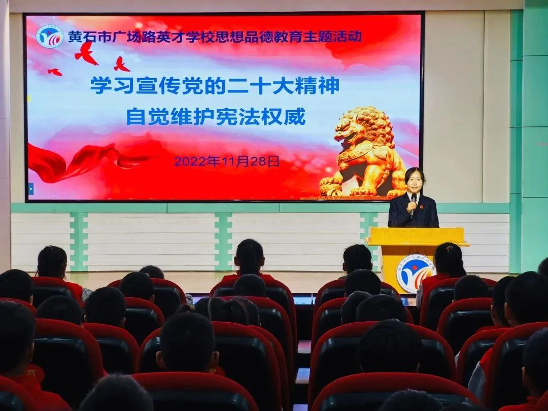 黄石港区人民法院走进黄石市广场路英才学校开展“送法进校园”活动。法官助理余松泉以“学习党的二十大精神自觉维护宪法权威”为主题,为现场学生宣讲宪法知识。余松泉结合学生的年龄阶段和认知特点讲解了宪法是什么,以及宪法与国家、与人民的关系,告诉学生要认真学习党的二十大精神,践行宪法精神,自觉维护宪法权威。